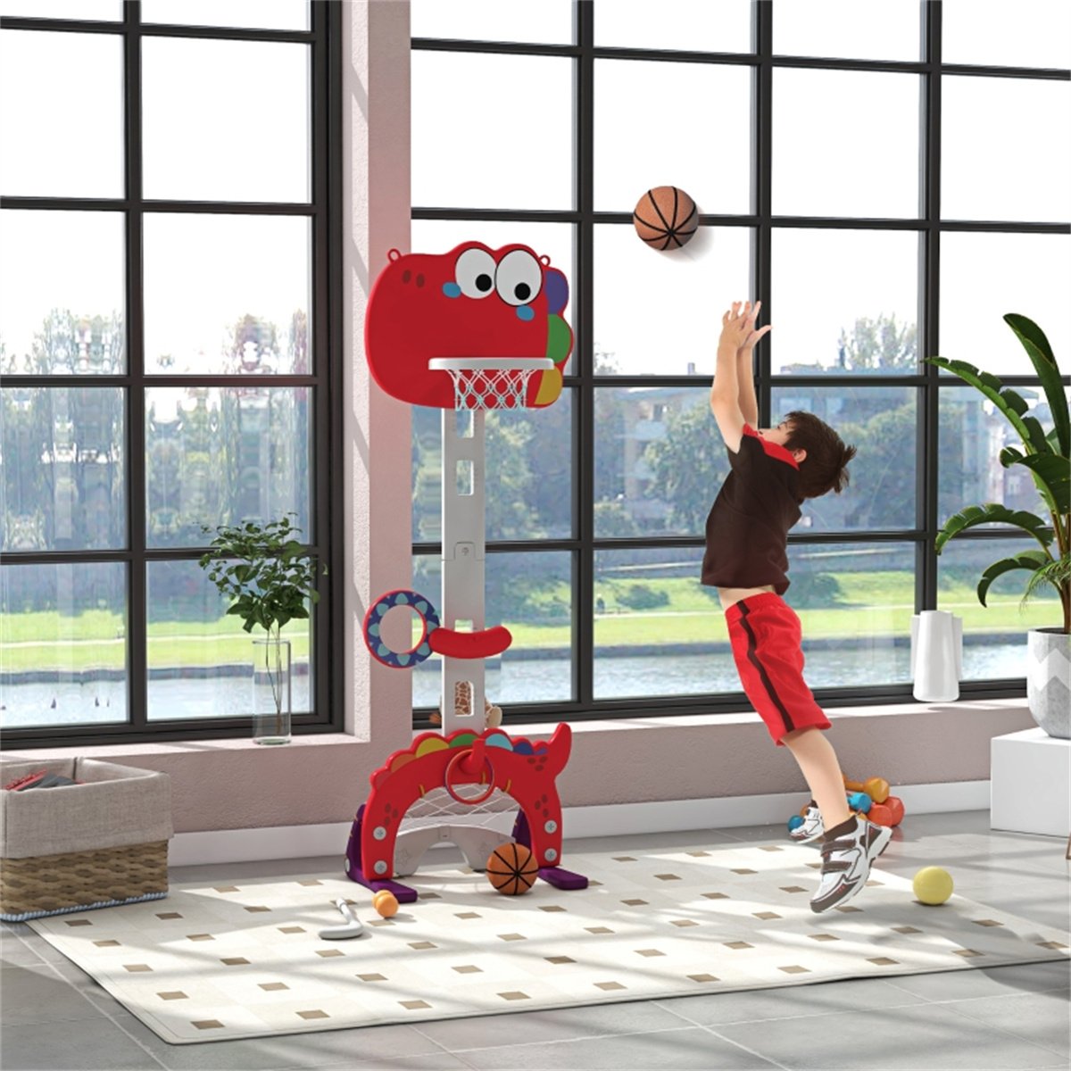 – This cute dinosaurs-themed basketball hoop boosts kids’ coordination and strength